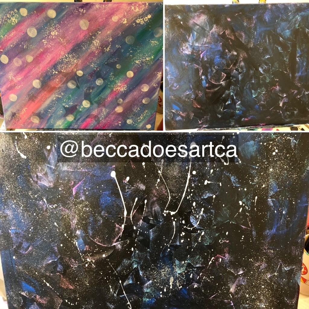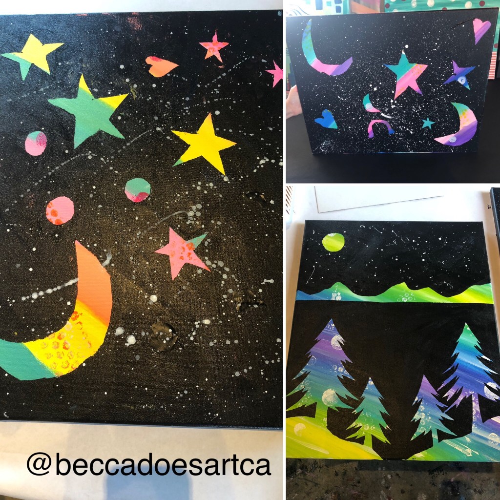 I first came across the idea of using contact paper as a resist when refinishing some furniture. I’ve since done several different versions of resists, some with mixed media, like my Birds and Words project. I like the idea of having one for each season so, in addition to redoing the leaves for fall like once before, and snowflakes for winter! Having a sample to show this project is essential. It can be hard for some younger kids to wrap their heads around what we are trying to do with the project, but peeling off the “stickers” to reveal the final project is always magical, and who doesn’t love a little splatter painting? So now: Contact Paper Resist Stars and Moon.